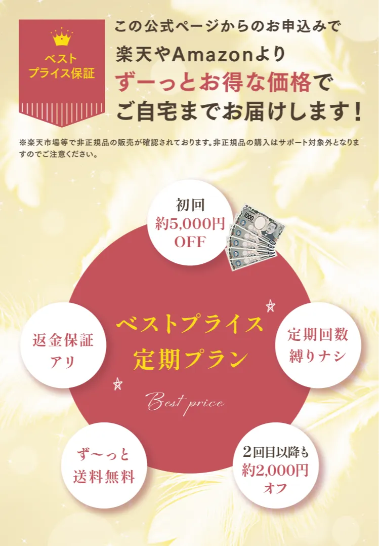 ・定期コースご契約の初回購入者様に限り、商品到着後15日以内のご使用で満足いただけない場合、返品・返金を保証致します。返金保証は初回購入時のみ適用されます。なお、事前にご連絡がない場合は返品をお受けできません。手数料・返送時の送料はお客様負担とさせていただきます。詳しくは特商法表記をご覧ください。